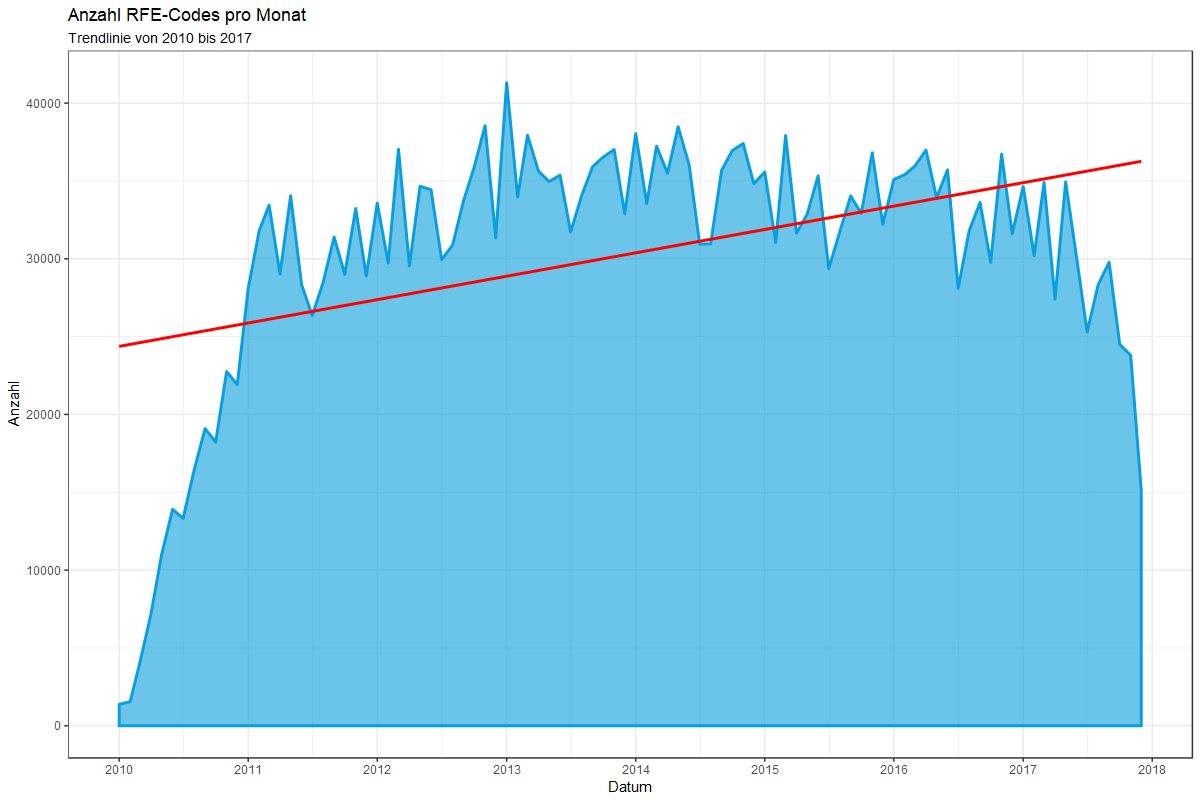 Dank der prozentualen Analyse wird ein klarer Trend feststellbar: Der Anteil an registrierten RFE-Codes 1 steigt kontinuierlich von Jahr zu Jahr, während der Anteil an registrierten Codes 4 konstant sinkt.