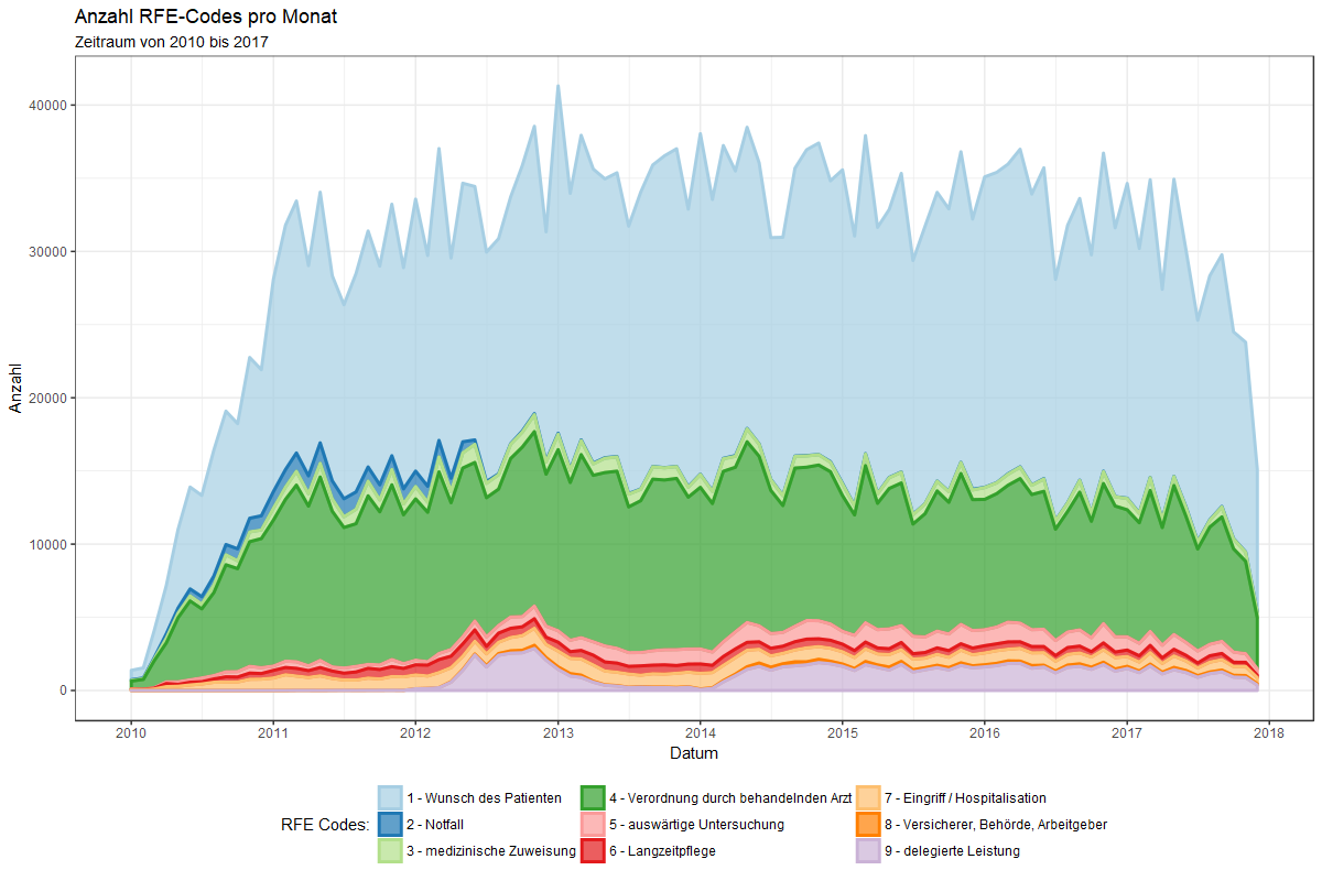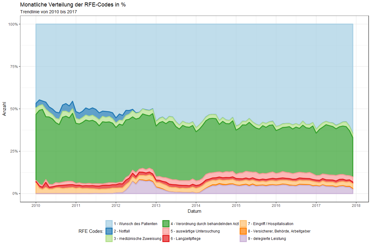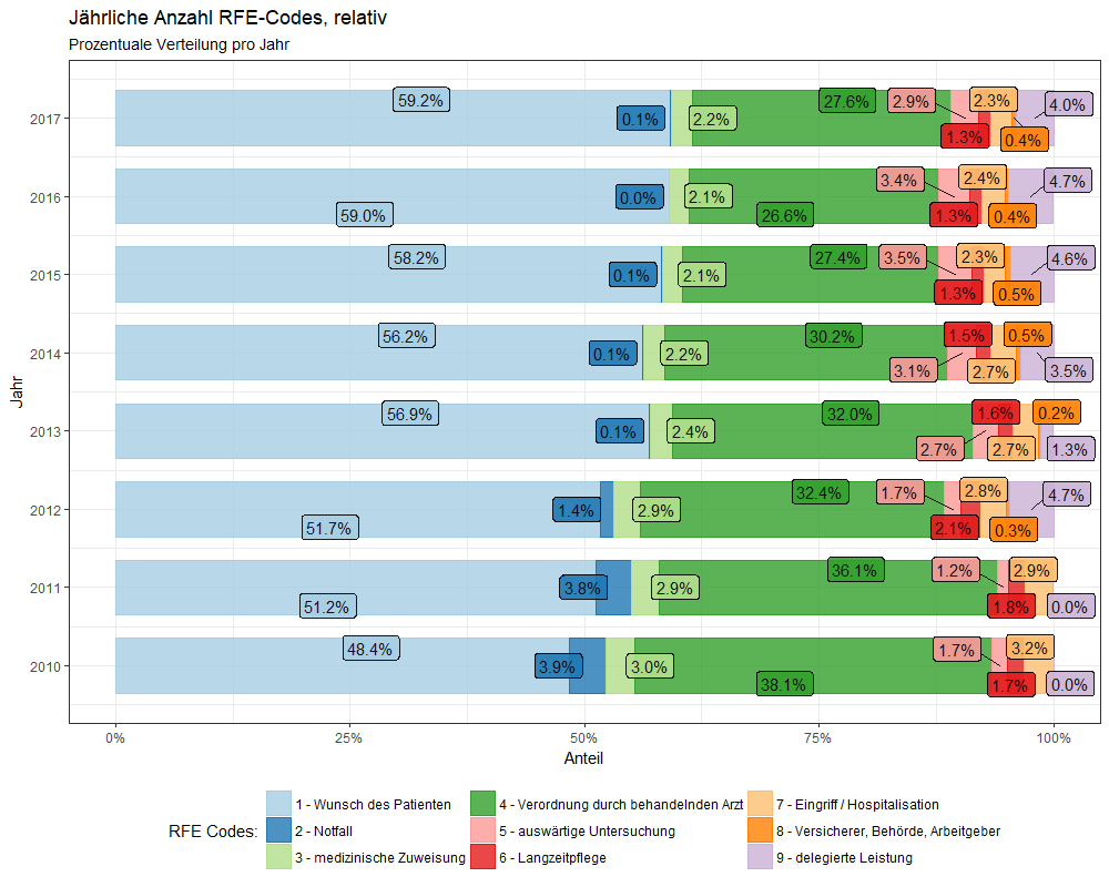Etwaige Bedenken, dass diese beiden Trends bezüglich RFE-Code 1 (Kontakt auf Wunsch des Patienten) und RFE-Code 4  (Folgekontakt auf Verordnung des behandelnden Arztes) durch die variierende Anzahl codierender Ärzte verursacht werden könnte, lassen sich einer Analyse der relativen Anteile der einzelnen RFE-Codes begegnen: